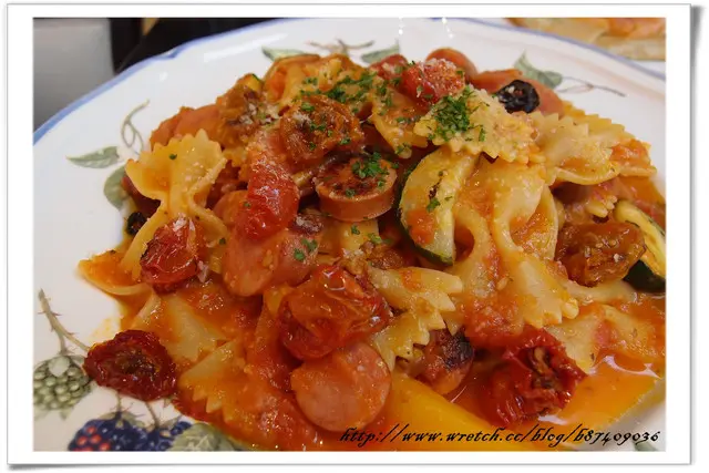 第三盤是"茄汁肉腸菌菇蔬菜麵"