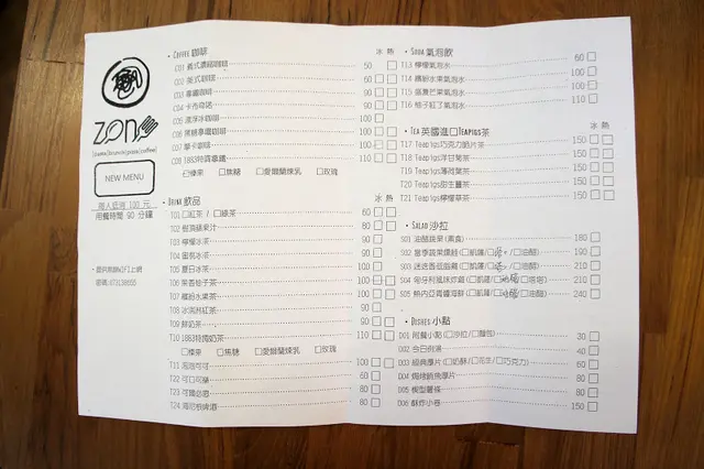 桌上都備有菜單,每人低消100元,用餐時間為90分鐘