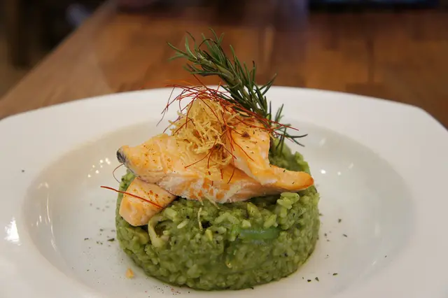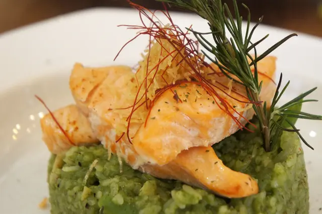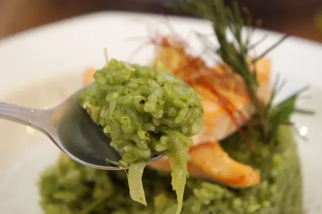 菠菜香草鮭魚燉飯使用新鮮菠菜打成汁,再加入洋蔥、蒜頭等材料拌炒後讓米飯吸收湯汁,米心是軟的吃起來是較濕潤的口感,帶有蒜香味