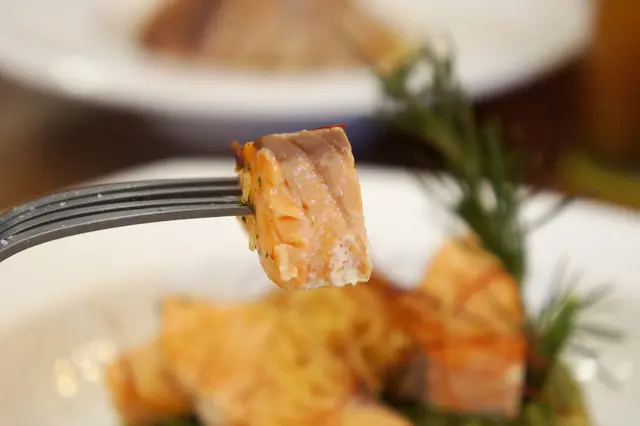 鮭魚先用清水煮過再煎,表面加點鹽巴調味,簡單料理吃得到鮭魚的美味與鮮嫩