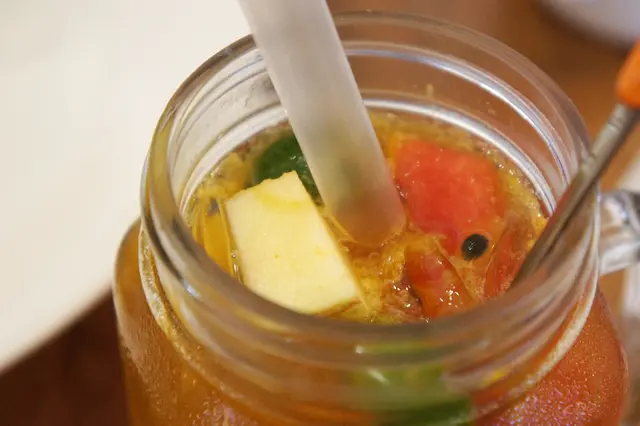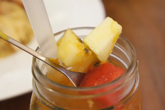 這是M先生加點的,其實菓子很不愛水果茶,因為外面賣得都太過甜膩,但弄咖啡的繽紛水果茶意外喝起來很順口,裡面有百香果、金桔、蘋果、西瓜等綜合水果,再用紅茶做底調味