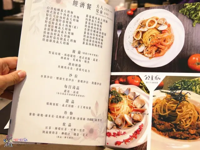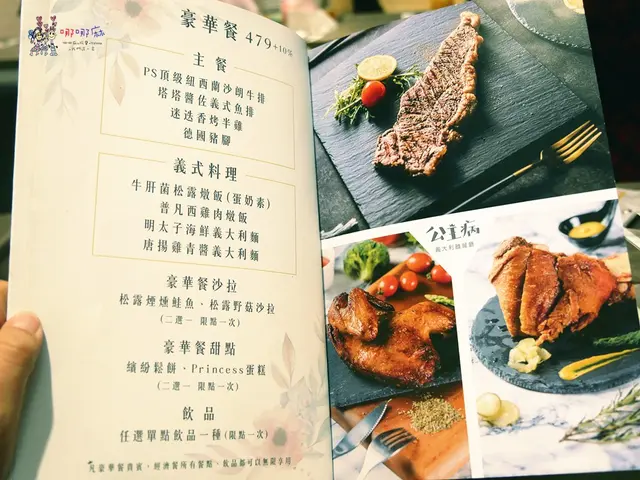 公主病的菜單分成吃到飽和單點兩種,吃到飽又分豪華餐和經濟餐兩種,豪華餐479元+10%,經濟餐359元+10%,豪華餐可以點經濟餐的餐點,怎麼看都覺得差120元還是豪華餐划算。