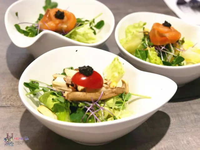 我們今天點的是豪華餐,先上來的是沙拉的部分,一直以來我就沒有很喜歡吃生的蔬菜,所以把上面的料吃完就把生菜丟給阿寶解決,反正他最近肉也吃很多,就多補充點纖維質吧!松露煙燻鮭魚和松露野菇沙拉,就是滿滿的松露味道這樣。