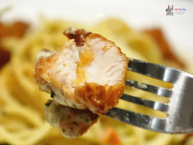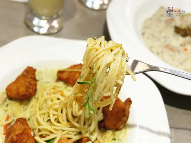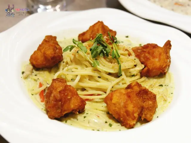 唐揚雞青醬義大利麵則是我出門前先爬過文,有獲得比較多好評的推薦款,視覺上沒有燉飯那麼華麗,不過我這種喜歡吃不健康食物的人,當然是被炸雞吸引了。