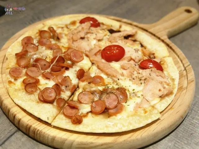 除了豪華餐我們也能點經濟餐,雖然很飽了,看著菜單上的披薩好像也很好吃的樣子,又點了一份德式香腸和燻雞肉雙拼。