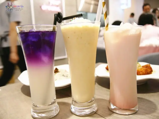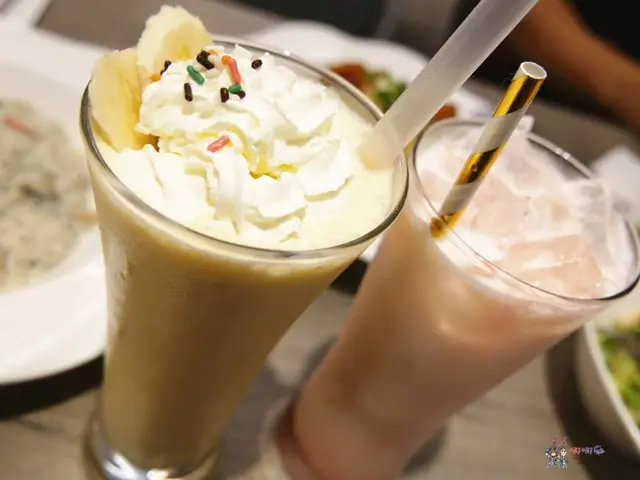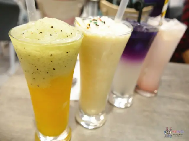 豪華餐的部分可以點一杯菜單上的飲料,我們點了公主病、蝶豆花檸檬汁、調色盤,阿寶的朋友又拿了一杯芒果香蕉奶昔來,說是新品請我們喝喝看。