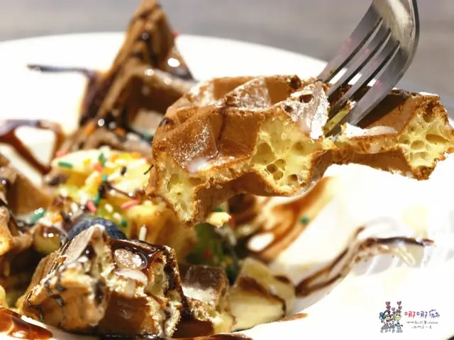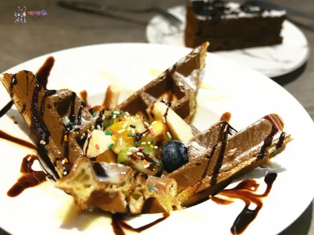豪華餐的繽紛鬆餅上桌,這個外表也一樣很樸素的繽紛鬆餅其實很有內涵,鬆餅口感是外酥內軟,非常香,在已經吃飽的時候,一人一塊比較剛好。