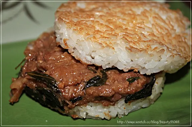 粒粒分明的米飯搭配著以九層塔還有特殊醬料製成的三杯雞米漢堡口味..
