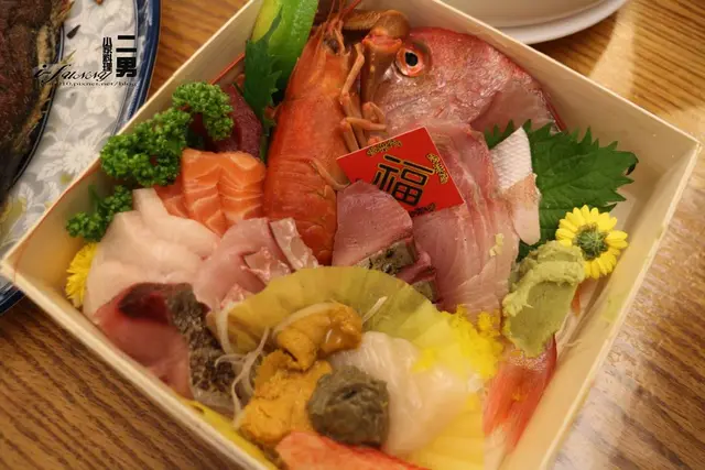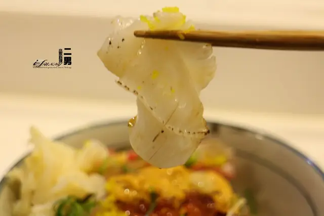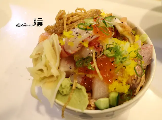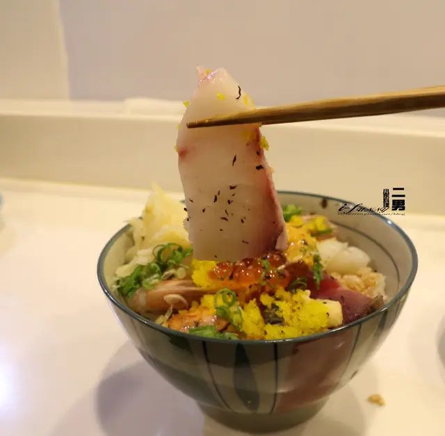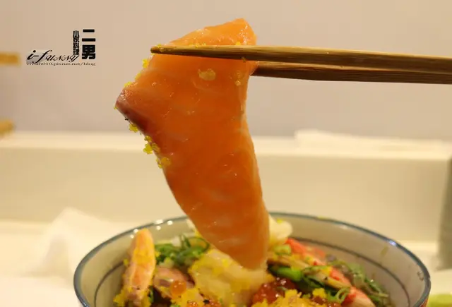 友人特地挑出碗內的鮭魚,發現二男荒海散壽司中的鮭魚,不僅有生魚片,還有炙燒過的,豐富了口感層次。
