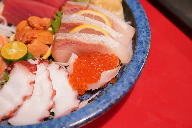 好像是一個藏寶盒的端上桌,還在閃閃發亮著!鮭魚、鮪魚、紅甘、北海道大干貝、馬糞海膽、熟章魚、花枝、鮭魚卵!而且還要厚切就對了!讓你每一口都享受那魚油的美味,滿嘴油脂的讓人好不是滋味!