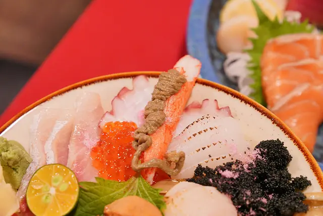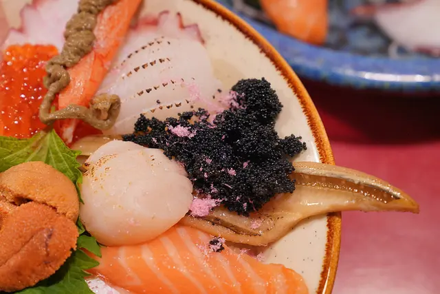 承接過來,重量馬上能感受出來這個磅礡氣勢!鮭魚、鮪魚、馬糞海膽、干貝、紅甘、星鰻、鮭魚卵、蟹膏、花枝、魚卵,堆疊了滿滿的食材,完全無法看到白飯的蹤影。