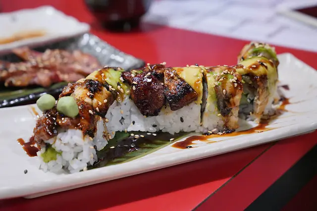 小黃瓜、酪梨、蟹腳、蒲燒鰻!成了一條可愛的小龍!前方那兩顆眼珠子可是哇沙米!千萬別一口吃進嘴裡