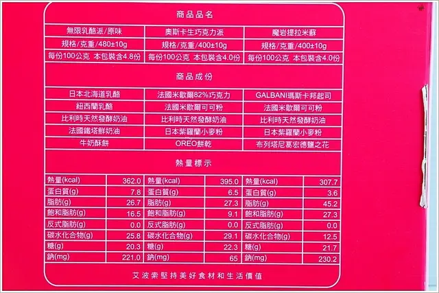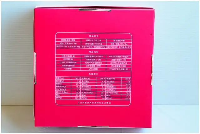 盒底也有各種蛋糕的規格、成份和營養標示。