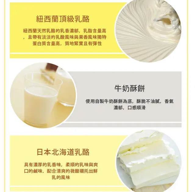 使用頂級乳酪起士原料,加上特製手工餅乾增加口感。