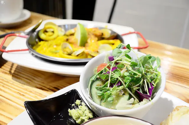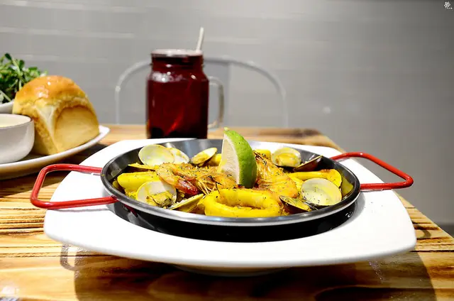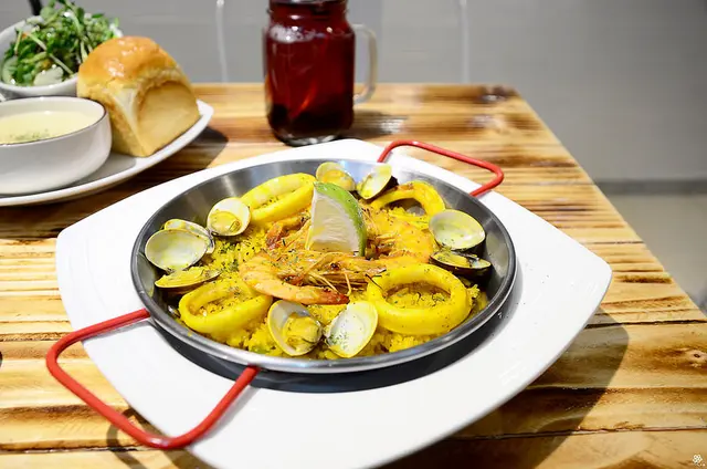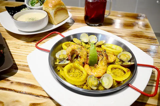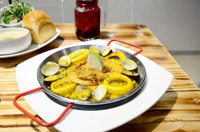 第一眼看到西班牙海鮮烤飯,只能享受黃澄澄的單一色彩,我覺得在視覺上可惜了些。