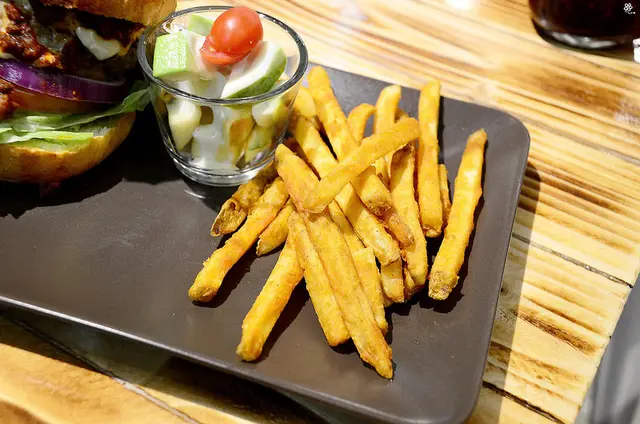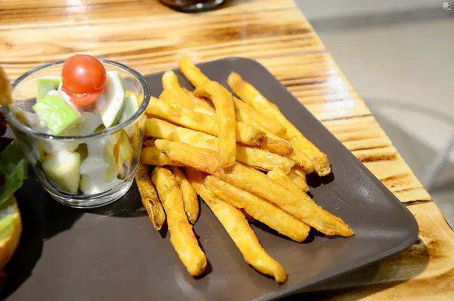 另外,漢堡系列也隨盤附上水果與優格醬,以及馬鈴薯薯條,