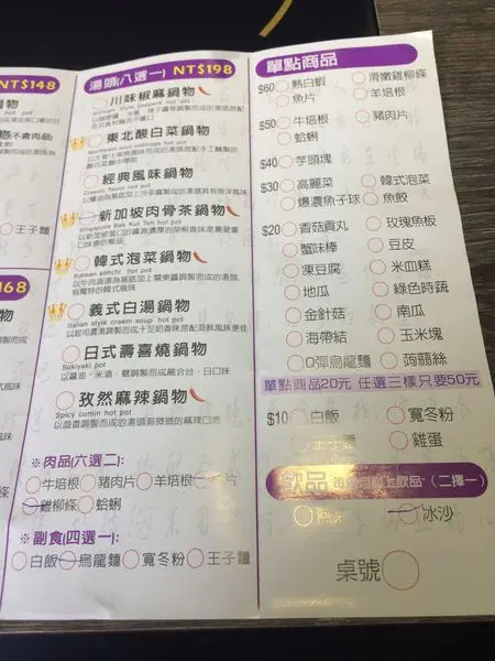 每鍋都附上飲品熱茶、冰沙二選一,要記得選唷!另外還有單點類菜單~