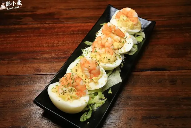 去頭去殼的橘紅色鮮蝦,溫馴地躺在剖半鮮黃水煮蛋上,