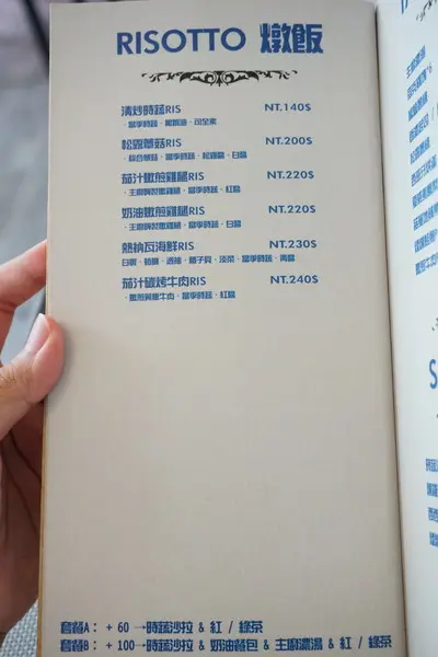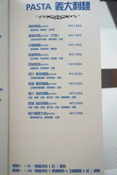 皆為單點可加價升級套餐套餐A+60元 附沙拉、紅茶/綠茶套餐B+100元 附沙拉、餐包、濃湯、紅茶/綠茶 開胃小點&沙拉