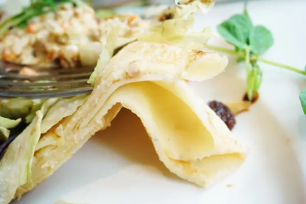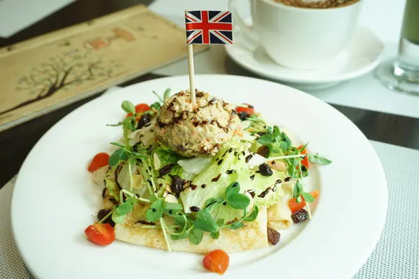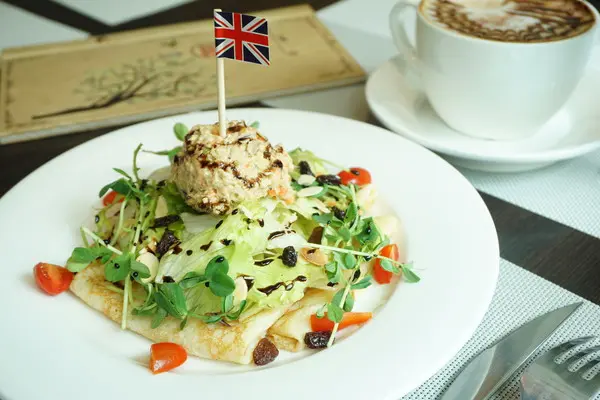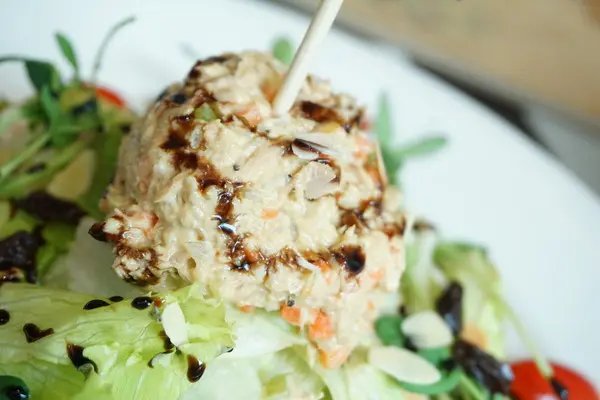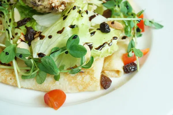 薄餅上鋪滿滿生菜在放上一球西西里鮪魚生菜頗豐富的還撒上了葡萄乾和小番茄用巧克力醬做裝飾擺盤很講究很用心呢 鮪魚沙拉很飽滿味道鹹香薄餅QQ軟軟的整體吃起來十分清爽
