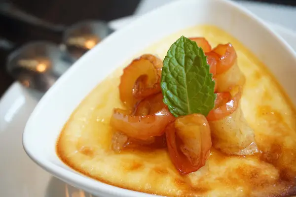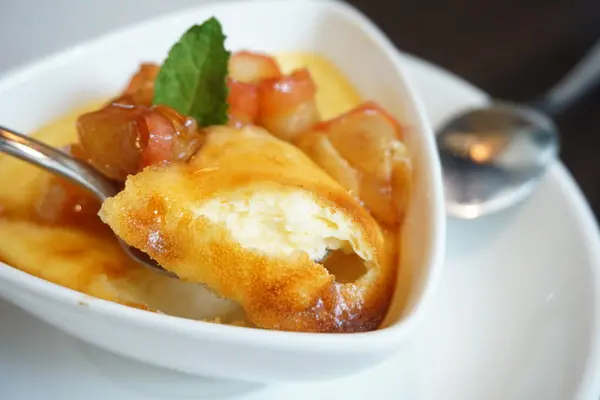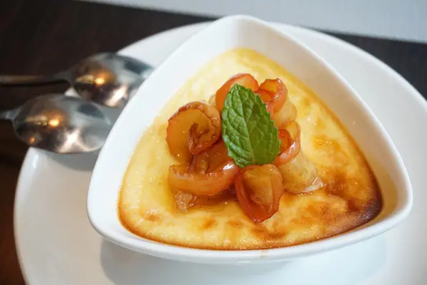 蘋果吃起來比較偏甜有點脆脆的焦糖口感蘋果下放有草莓果醬烤布丁吃起來比較不甜像是布蕾的口感蘋果和布丁一起吃兩者搭配剛剛好!!意外很棒的手工甜點耶!!!!