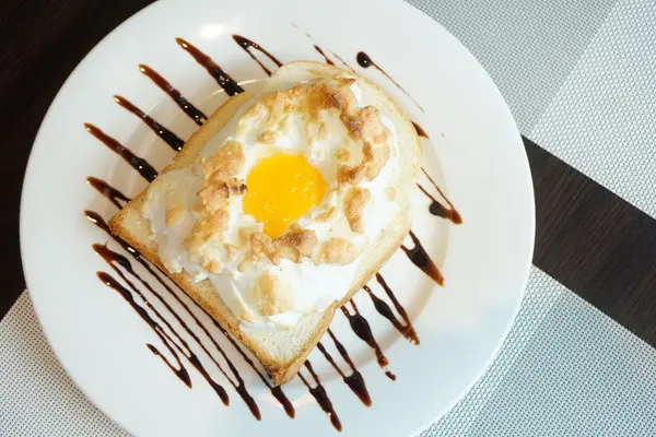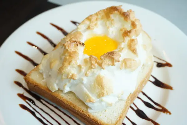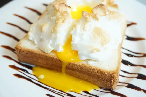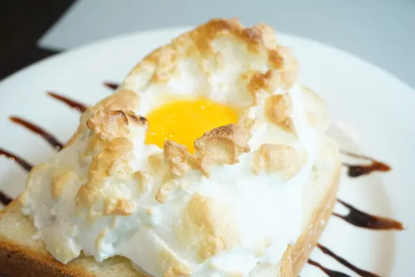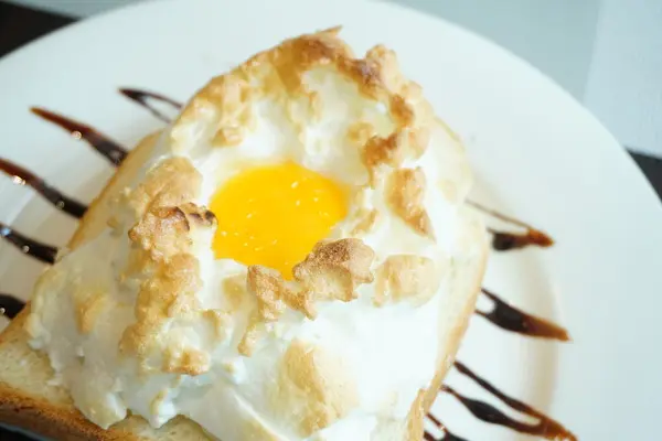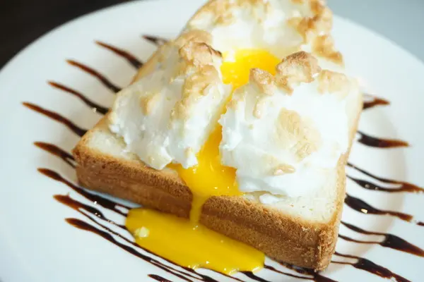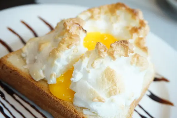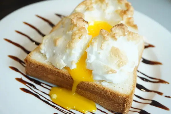 使用厚片吐司撒上糖粉烘烤吃起來來微微甜甜的有點像是蜜糖吐司的作法 蛋白霜真的是入口即化!!!!綿綿的口感好舒服xD!!!!而且味道很新鮮沒有蛋腥味滑嫩的口感真的很特別很好吃呢!!!只有雨天限定的喔!!!