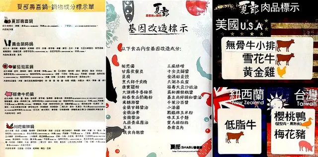 入口處櫃枱前有湯底成份標示,基因改造標示產品及肉品來源,