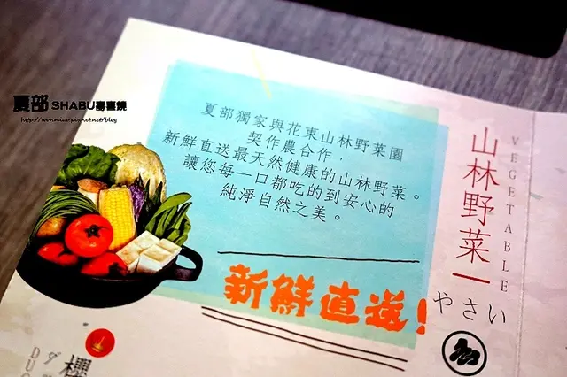 這回來到夏部壽喜燒,菜單上白紙黑字清楚標明了新鮮直送花東山林野菜,