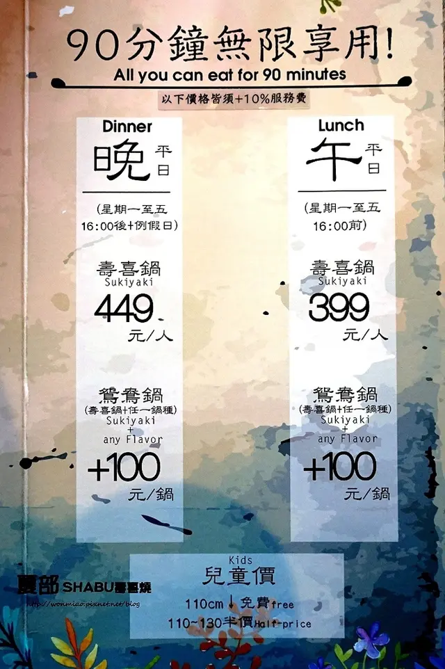 夏部壽喜燒的消費方式是採吃到飽的方式,用餐時間為90分鐘,