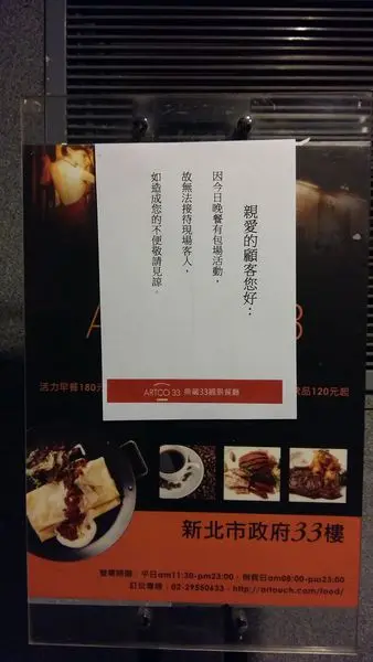 「典藏ARTCO 33觀景餐廳」位於新北市政府33樓,從市府正門口進入,必須搭乘市府大廳的18、19號電梯直達。
