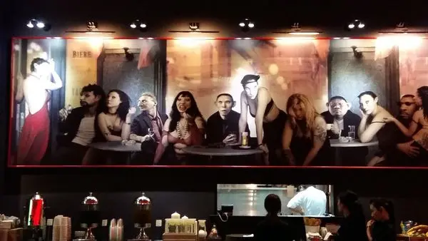 牆上的畫布是數位影像藝術家-李小鏡先生的作品-夜生活。讓人覺得畫面中西方半人半獸的群像,以衣香鬢影夾雜魅惑眼神,正以一種既能看透又逼真扮演的形式,展演出現代人〈夜生活〉的本質,饒富趣味性。