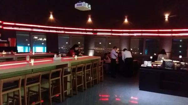 靠窗邊為圓弧向外延伸設有觀景台,能180°度俯瞰新北市景色,華燈初上,頭上腳下都滿佈著人間與蒼穹的繁星點點。夜晚到此,三五好友聚首小酌,遠離都會喧囂的煙塵,欣賞美麗夜景的同時沉澱身心。