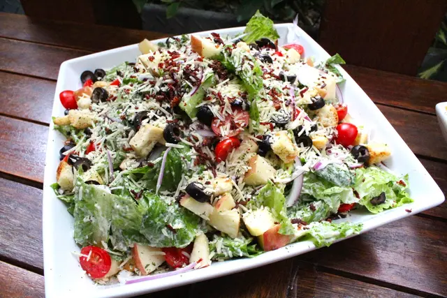 沙拉裡面有生菜、番茄、蘋果、黑橄欖、麵包丁、起司
