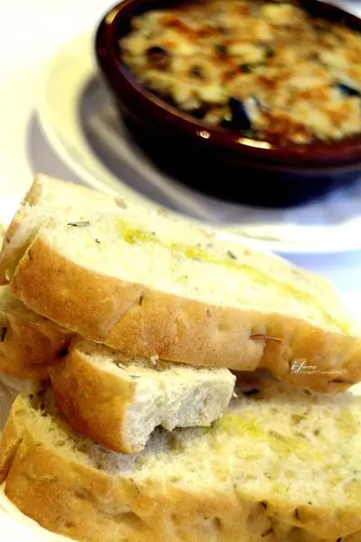 一旁附了兩塊佛卡夏,拿來沾著醬汁吃,正是義大利當地食用文化,