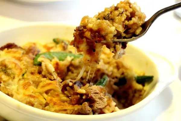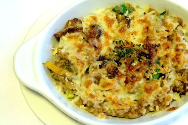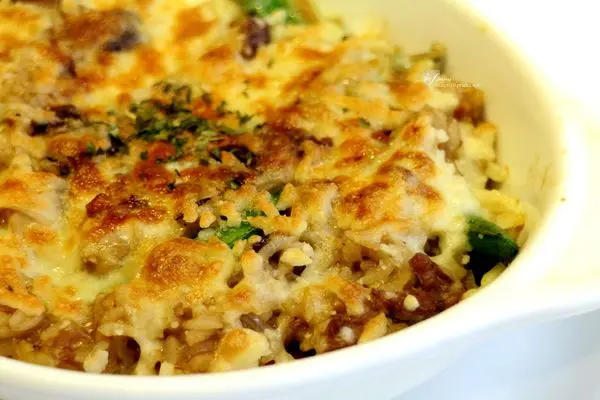 焗飯表面烤得金黃酥脆,一上桌就香氣逼人!