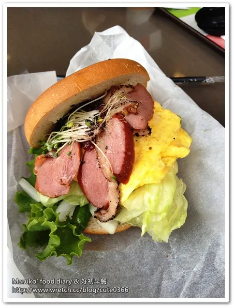 百放上生菜、洋蔥、煎蛋、苜蓿芽再加上店家自製的李子醬,醬汁有一點蜜汁的甜味,搭配