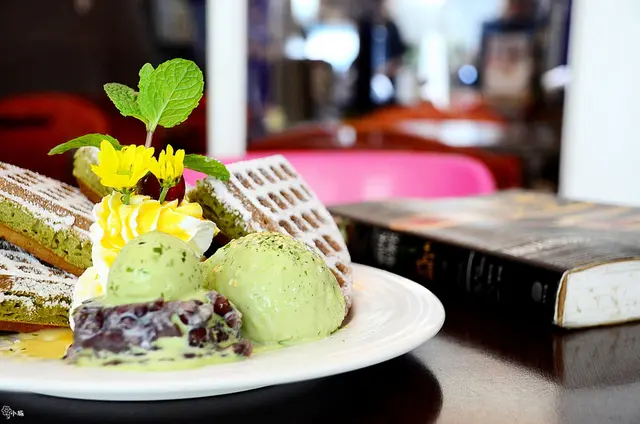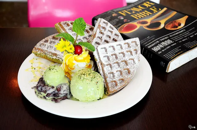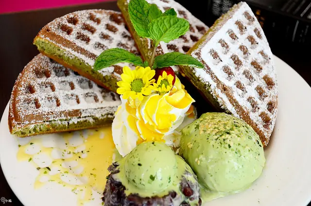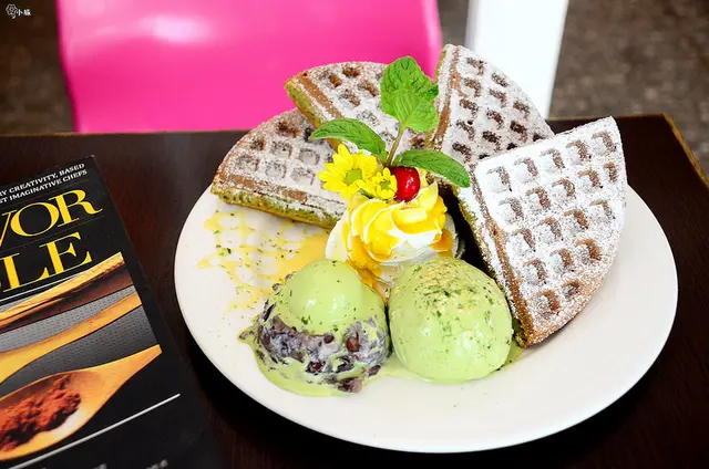 緩緩滴下的明治抹茶冰淇淋、亮眼鮮黃的芒果鮮奶油、抹茶綠口味的格子鬆餅、甚至是暗紅堆疊的桂圓紅豆泥,
