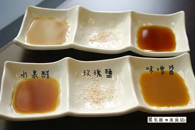 水果醋-帶點酸甜非常清爽解膩、玫瑰鹽-增添肉類口感、味噌醬-帶有淡淡的酒粕清香。