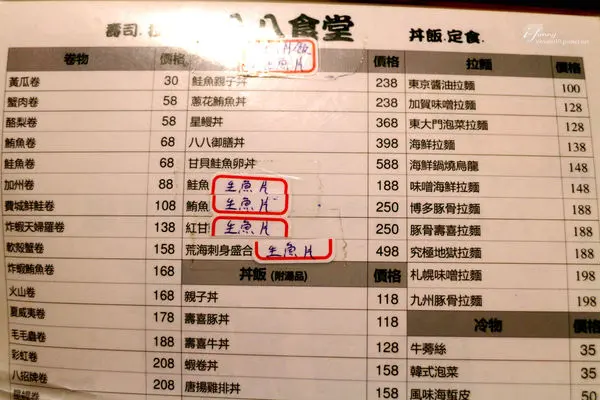 八八食堂餐點提供卷物、生魚片、丼飯、拉麵及冷物。