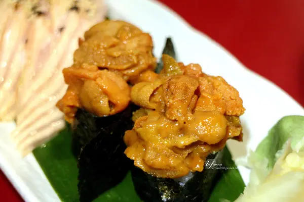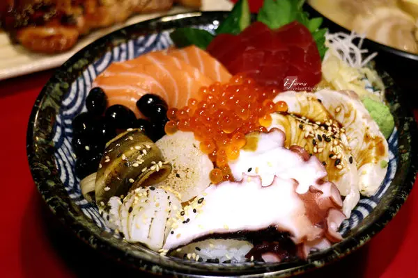 裡頭有黑豆、鮭魚、鮪魚、炙燒紅魽、花枝、炙燒干貝、軟絲、日本星鰻及鮭魚卵。