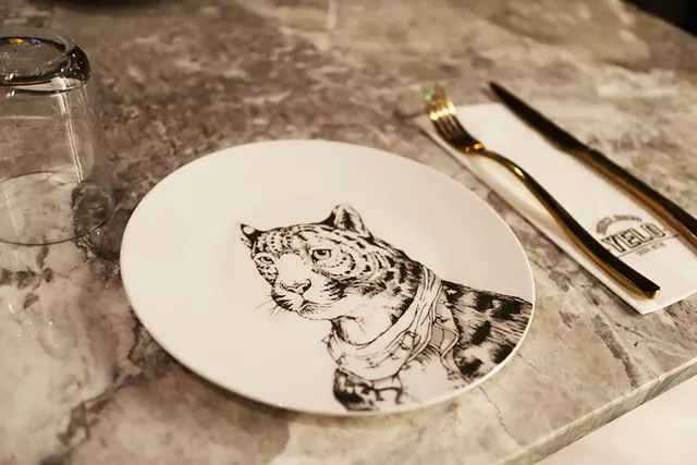 店家的餐盤相當有質感,有老虎及貓頭鷹的圖樣,刀叉也相當精緻呢