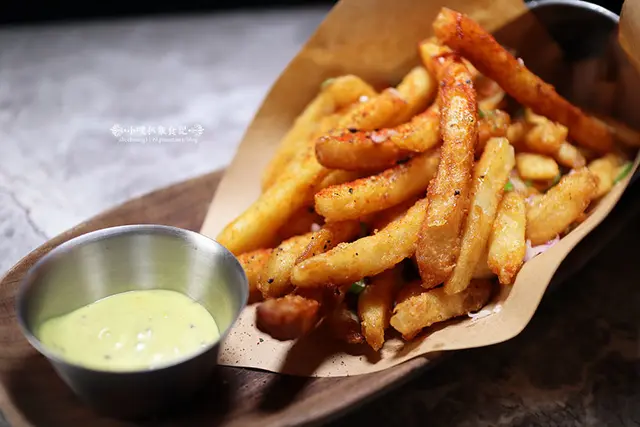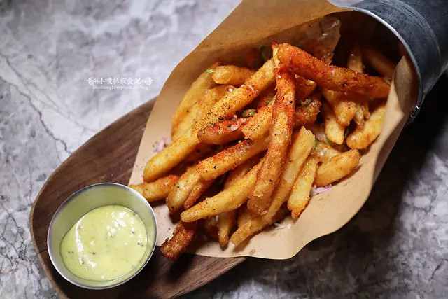 薯條炸至外層酥脆,內層相當綿密好吃,薯條有事先以紅辣椒粉及蒜味調味,再拌入巴西里香料