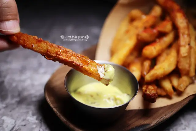沾附店家獨家的蒜味蜂蜜芥末醬,鹹甜口感,加上蒜味香氣,相當調和美味,醬料相當濃郁,香氣十足的黃芥末醬,搭配薯條相當合拍!!!