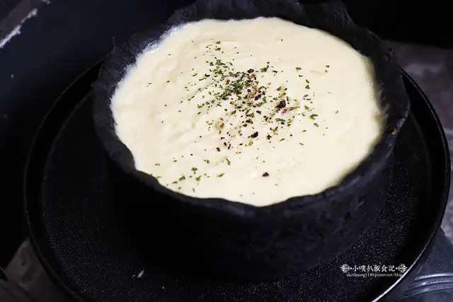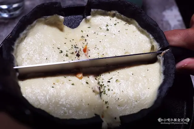 這時桌邊服務到了,服務生弟弟開始用寬切刀,一刀下去,這時滿滿的起司土石流,狂奔的起司白醬,立即狂流而出,如同一場驚豔的起司狂奔秀