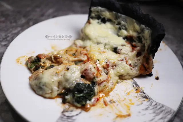 立刻用刀鏟鏟起比薩,特意做成有高度的竹炭餅皮,餅皮外皮酥脆,內層是紮實有嚼勁的麵皮(店家是使用卡普托麵粉專用店)