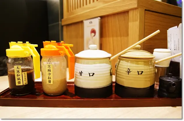 桌上佐醬玉蔥和風醬及芝麻沙拉醬用來沾生菜一起吃,另外甘口及辛口(但其實不辣)是豬排沾醬