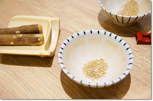 用一旁的山椒棒將芝麻研磨成細粉或小顆粒之後,再依照個人喜好加入豬排醬!
