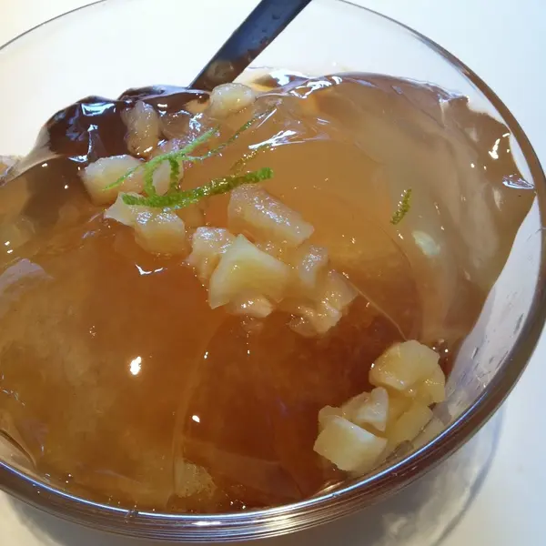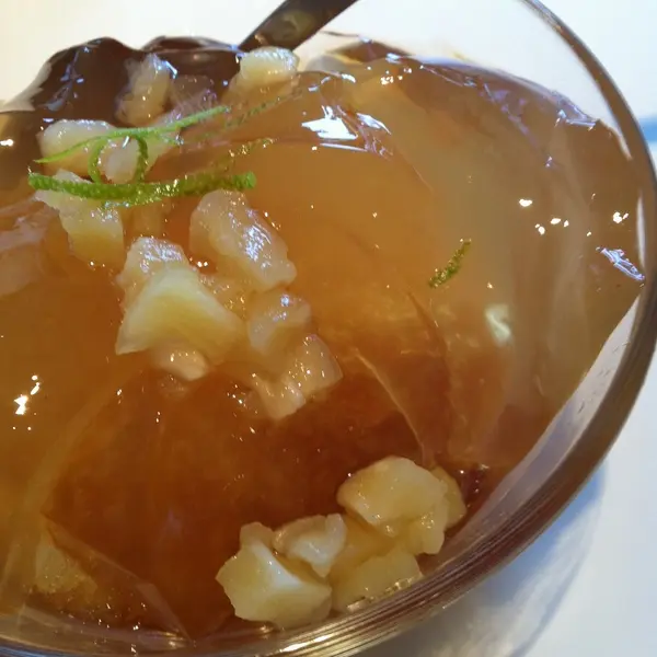 軟軟愛玉的上頭是甜甜鳳梨小塊與清香檸檬刨絲。