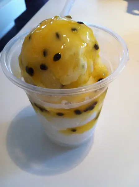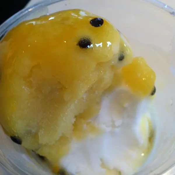 上面是百香果的冰在撒上百香果的汁,酸甜好吃,咬籽籽的喀茲感十足~ (陶醉中)