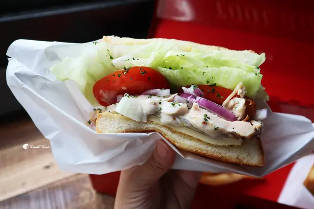 這份三明治裡有生菜、艾曼塔起司、牛蕃茄、酸黃瓜、舒肥雞胸肉,舒肥雞胸肉真的好美味,相當軟嫰,整體口感相當棒,整份吃完保證你飽飽滴。